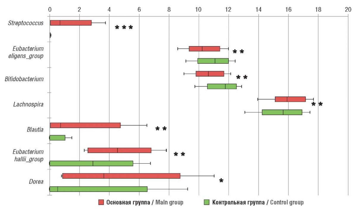 Между тем в вопросе особенностей родового и видового состава микробиоты при эндомериозе до сих пор нет единого мнения. Ряд авторов указывают на увеличение представителей Proteobacteria, Actinobacteria, Cyanobacteria, Saccharibacteria, Fusobacteria, Acidobacteria и Patescibacteria [21][22]. L. Huang с соавт. демонстрируют повышение численности Eggerthellalenta и Eubacteriumdolichum на фоне уменьшения Clostridia, Ruminococcus и Lachnospiraceae [23]. В. Ata с соавт. отмечают значимое снижение представленности родов Sneathia, Barnesella и Gardnerella [24]. В ходе нашего исследования у пациенток с НГЭ установлено статистически значимое повышение численности родов Lachnospira, Blautia, Dorea, Streptococcus, Eubacterium рallii_group и достоверное снижение Bifidobacterium и Eubacterium eligens_group. Указанные микроорганизмы обладают выраженным иммуномодулирующим потенциалом, регулируют проницаемость кишечного барьера, продуцируют короткоцепочечные жирные кислоты и другие метаболиты.