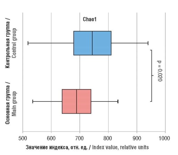 Обработку полученных данных осуществляли при использовании пакетов ПО Trimmomatic [13] и QIIME [14]. Таксономическая принадлежность прочтений осуществлялась с помощью баз данных CosmosID Metagenomics (www.cosmosid.com) и KEGG Pathogen, MicrobeNet (A CDC Virtual Reference Laboratory, https://microbenet.cdc.gov). Анализ α-разнообразия микробного сообщества проводили посредством расчета индекса Chao1, числа обнаруженных таксонов (± SD; Sobs ) и показателя, демонстрирующего реальное количество таксонов (англ. Abundance Coverage Estimator, ACE).