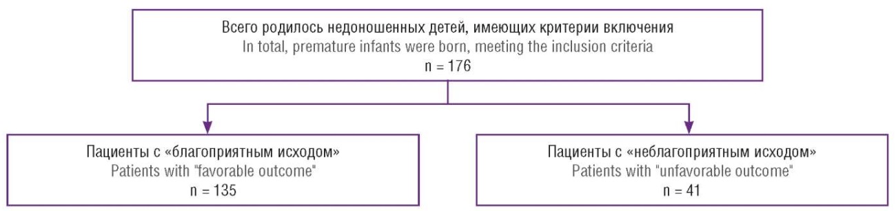 Рисунок 1. Блок-схема учета всех недоношенных пациентов, рожденных в перинатальном центре за период с 01.01.2023 по 01.11.2023. Две заключительные группы исследования: группа 1 «благоприятный исход» (n = 135) и группа 2 «неблагоприятный исход» (n = 41) в неонатальном периоде.