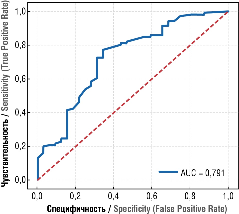 Чтобы оценить диагностическую значимость количественных признаков при прогнозировании определенного исхода, в том числе вероятности наступления исхода, рассчитанной с помощью регрессионной модели, использовался метод анализа ROC-кривых. С его помощью определялось оптимальное разделение значений количественного признака, позволяющее классифицировать пациентов по степени риска исхода, обладающее наилучшим сочетанием чувствительности и специфичности. Качество прогностической модели, полученной данным методом, оценивалось, исходя из значений площади под ROC-кривой со стандартной ошибкой и 95 % ДИ и уровня статистической значимости. Различия считали статистически значимыми при p ≤ 0,05, использовали двусторонний р-уровень значимости.