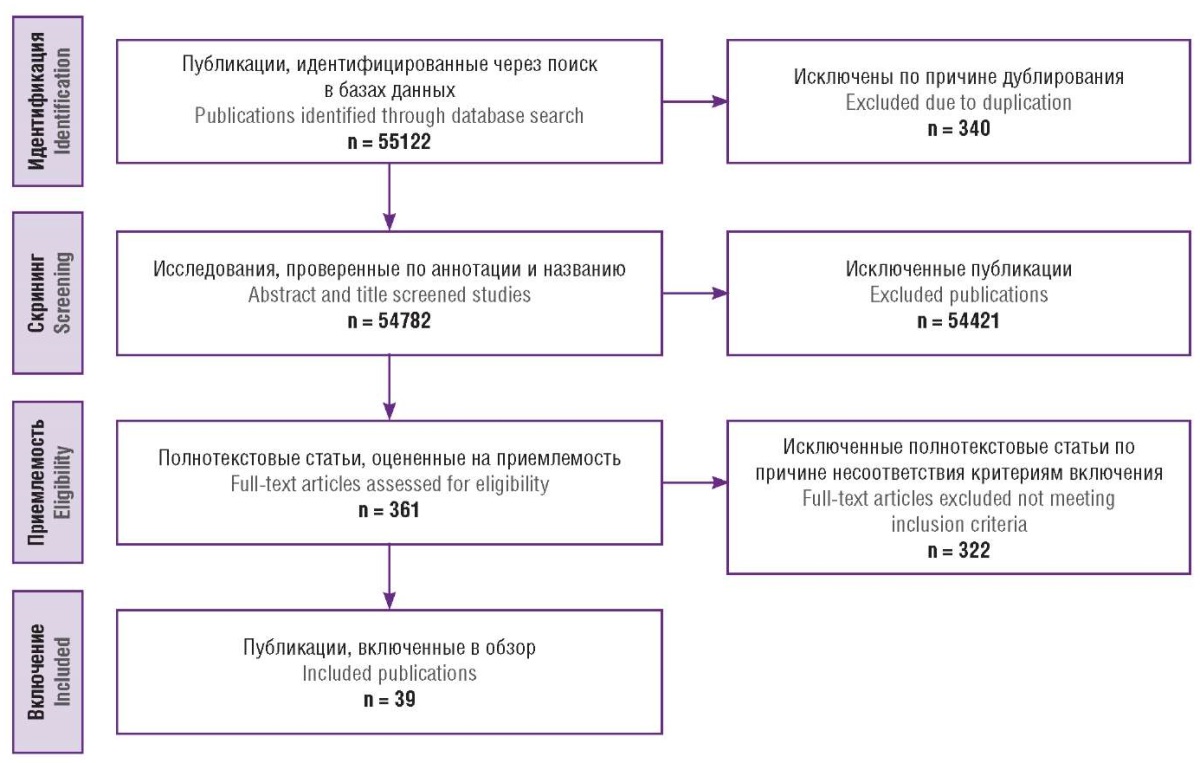 Поиск информации осуществлялся в электронных базах данных PubMed/MEDLINE, еLibrary и Google Scholar с использованием ключевых слов на русском и английском языках: «рак молочной железы», «ранний рак молочной железы», «молекулярные маркеры опухолевых клеток», «химиотерапия», «гормонотерапия», «рецепторы эстрогенов и прогестерона», «трижды негативный рак молочной железы», «неоадъювантная химиотерапия», «полный патоморфологический ответ», «иммуногистохимия», «breast cancer», «early breast cancer», «molecular markers of tumor cells», «chemotherapy», «hormone therapy», «estrogen and progesterone receptors», «triple-negative breast cancer», «neoadjuvant chemotherapy», «complete pathological response», «immunohistochemistry». Поиск публикаций проводился согласно рекомендациям PRISMA. Авторы независимо друг от друга занимались поиском публикаций, при возникновении разногласий решение принималось путем консенсуса. Временной интервал поиска: с момента основания соответствующей базы данных по ноябрь 2024 г. В результате поиска было найдено 55122 публикаций. Проводился анализ результатов исследований, а также анализ литературы в отобранных исследованиях.