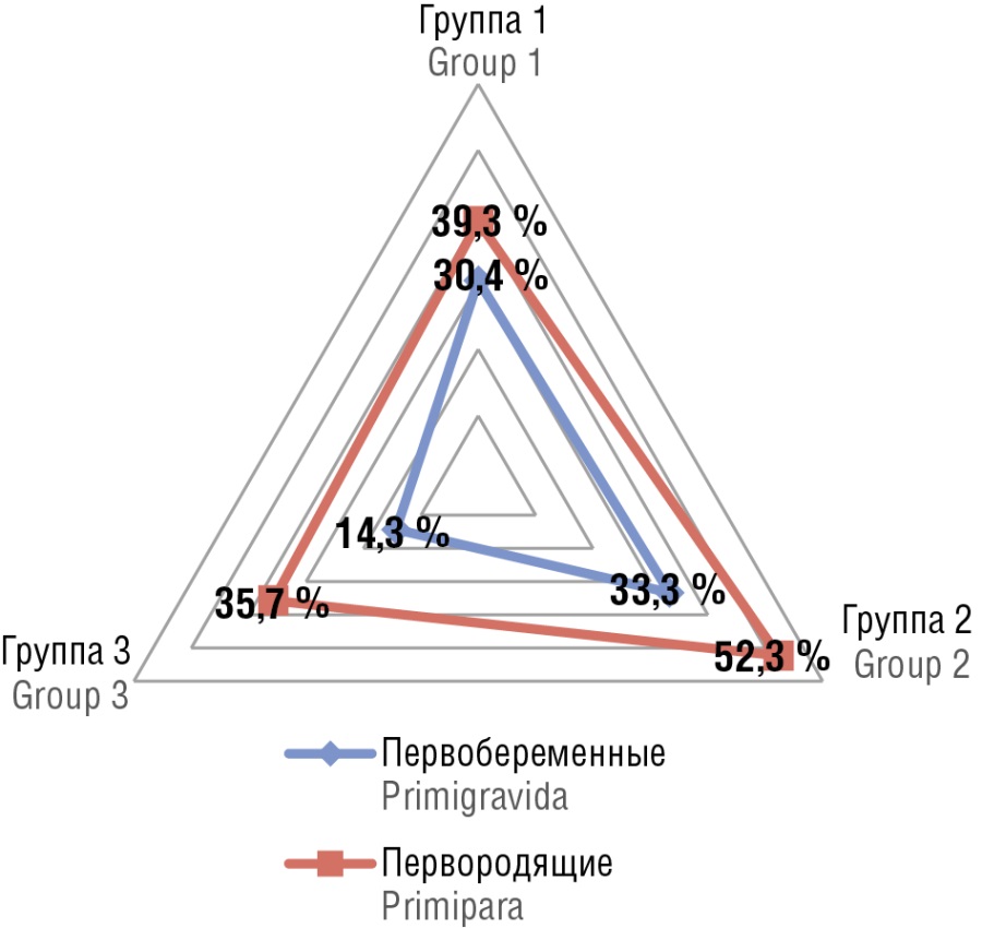 В группе 3 было всего 16 (17,58 %) беременных, из них 5 (31,25 %) первородящих и только 2 (12,50 %) первобеременных (табл. 1). Остальные женщины в этой группе (56,25 %) уже имели в анамнезе роды (повторонородящие).