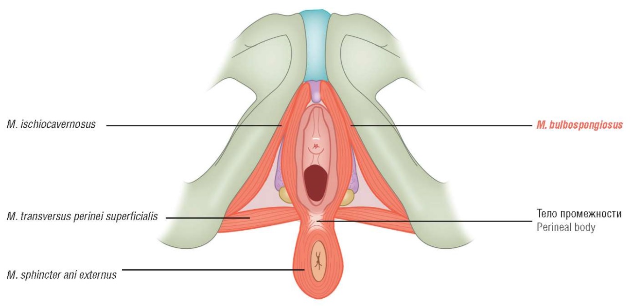 Любое повреждение тканей промежности сопровождается нарушением целостности комплекса m. bulbospongiosus (ранее называвшейся m. constrictor cunni) и поверхностной поперечной мышцы промежности (m. transversus perinei superficialis), что приводит к невозможности смыкания половой щели, и если поврежденные мышцы восстановлены неадекватно, то результатом будет зияние половой щели, что в дальнейшем приводит к развитию ПТО [44].