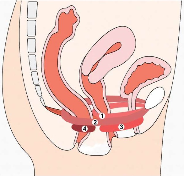 Figure 3. Topography of the pelvic floor muscle complex that compresses the urethra, vagina and rectum, diagram: 1 – m. pubovaginalis; 2 – m. puborectalis; 3 – m. sphincter urethrovaginalis; 4 – sphincter ani externus [drawn by the author Dikke G.B.].