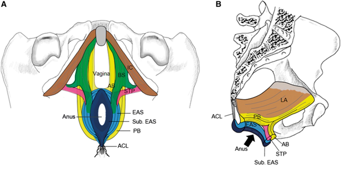 Note: AB – anterior fasciculus of the anterior part of m. levator ani; ACL – anococcygeal ligament; BS – m. bulbospongiosus; EAS – sphincter ani externus; LA – m. levator ani; PB – posterior fasciculus of the anterior part of m. levator ani; STP – m. transversus perinei superficialis; Sub. EAS – subcutaneous part of EAS; IC – m. ischiocavernosus.