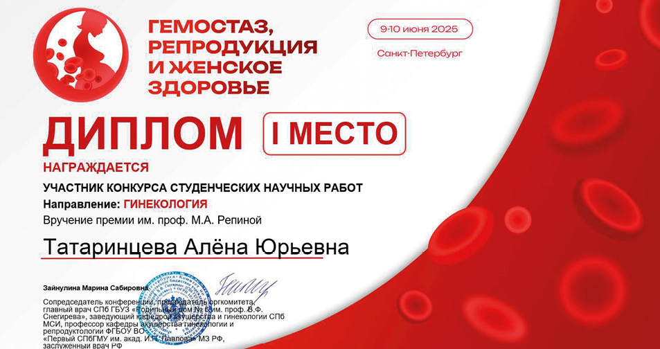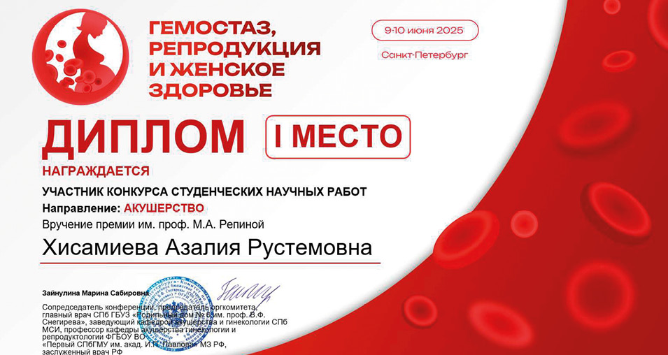 Students from the Sechenov University have winned at the Competition of the Conference "Hemostasis, Reproduction and Women's health". Obstetrics, Gynecology and Reproduction. 2025;19(3):461. (In Russ.)