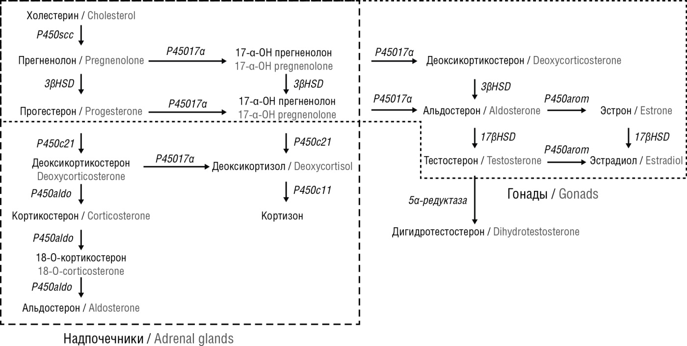 Примечание: P450scc – фермент семейства цитохром Р450, расщепляющий боковую цепь; 3βHSD – 3β-гидроксистероиддегидрогеназа; 17βHSD – 17β-гидроксистероиддегидрогеназа; P45017α – фермент семейства цитохром P45017α; P450c21 – фермент семейства цитохром Р450с21; P450c11 – фермент семейства цитохром Р450с11; P450aldo – фермент семейства цитохром P450aldo; P450arom – фермент семейства цитохром P450arom (ароматаза); 5α-редуктаза – фермент семейства оксидоредуктаз.