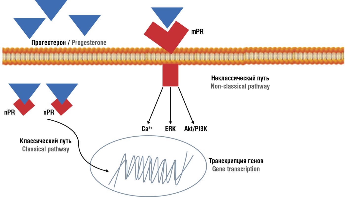 Действие прогестерона определяется за счет активации классических и неклассических сигнальных путей [26]. Приоритетным является классический путь, когда прогестерон связывается со своим рецептором из суперсемейства ядерных рецепторов факторов транскрипции [26]. Существуют 2 основные изоформы рецепторов прогестерона (англ. progesterone receptor, PR): PR-A и PR-B. Соединение молекулы прогестерона с его рецептором в гормон-рецепторный комплекс индуцирует его транслокацию в ядро, где инициируется транскрипция широкого спектра белков через димеризацию и транслокацию ядерного рецептора прогестерона (англ. nuclear progesterone receptor, nPR) в ядро [27]. Существует и неклассический путь, который производит более быстрые действия путем активации рецепторов на клеточной мембране, которые напоминают рецепторы, связанные с G-белком, и мембранный рецептор прогестерона (mPR) с последующей активацией нескольких вторичных мессенджеров, таких как повышение внутриклеточного кальция (Ca²⁺) (с этим же связывают воздействие прогестерона на сперматогенез: стимулирующее капацитацию сперматозоидов/акросомную реакцию [28–32]), киназ, регулируемых внеклеточными сигналами (англ. extracellular signal regulated kinases, ERK) и митоген-активируемой протеинкиназы (англ. mitogen-activated protein kinase, MAPК) или протеинкиназыB/фосфатидилинозитол-3-киназы (англ. protein kinase B/phosphoinositol-3 kinase, Akt/PI3K) [13][33] (рис. 4) [13].