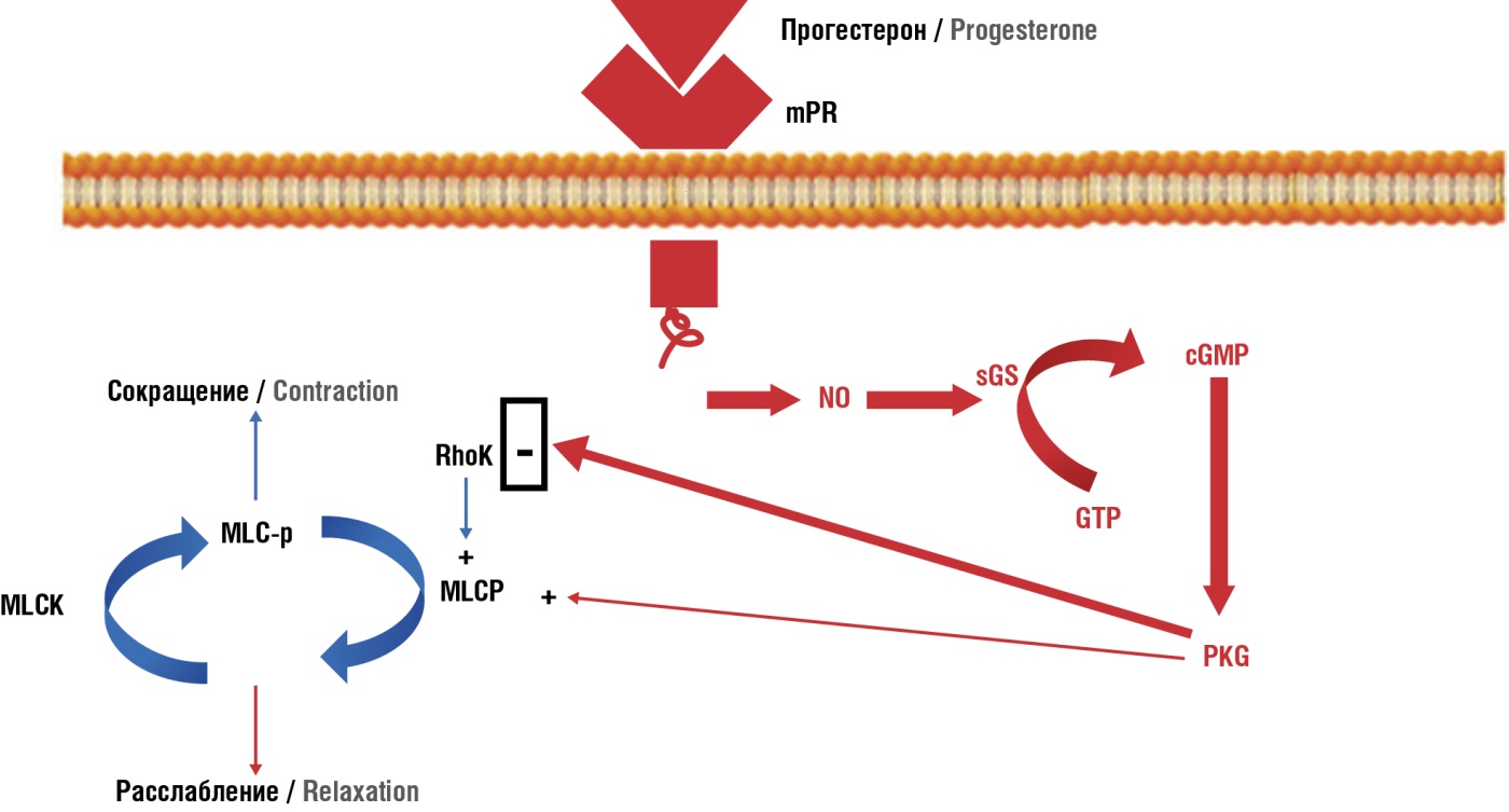 Примечание: mPR – мембранный рецептор прогестерона; NO – оксид азота; сGМP – циклический гуанозинмонофосфат; GTP – гуанозинтрифосфат; PKG – протеинкиназа G; RhoK – Rho-киназа; MLCР – фосфатаза легкой цепи миозина; sGS – растворимая гуанилатциклаза; MLC – легкая цепь миозина; MLC-р – фосфорилирование легкой цепи миозина; MLCК – киназа легкой цепи миозина.