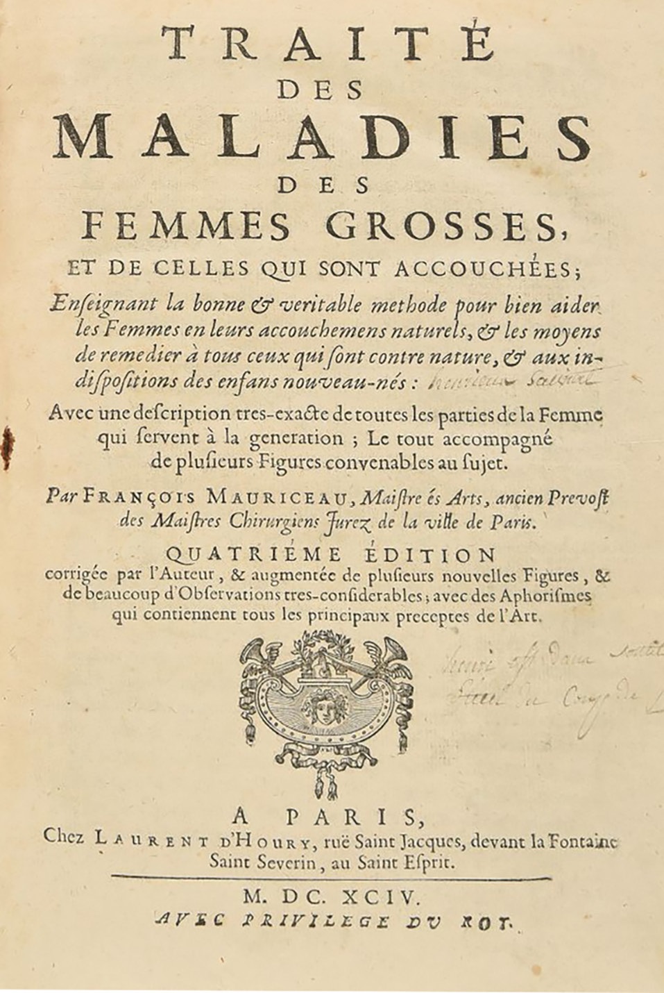 4. Mauriceau F. Traité des maladies des femmes grosses, et de celles qui sont accouchées. Paris: chez Laurent d'Houry, par Jean Anisson, 1694. 32 p.