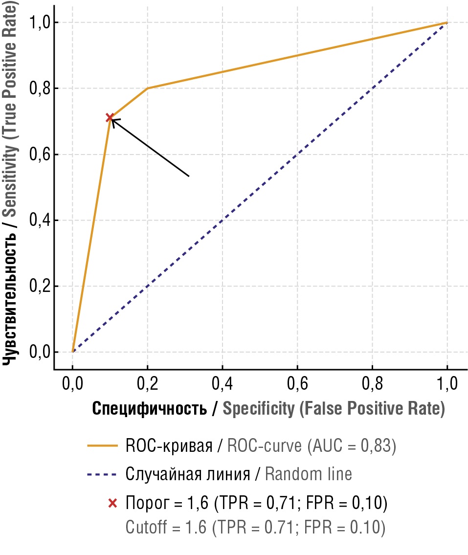 Детальный анализ индекса Юдена позволил определить оптимальное пороговое значение соотношения vWF/ADAMTS-13, при котором достигается наилучший баланс между чувствительностью и специфичностью теста. Максимальное значение индекса Юдена (0,61) наблюдалось при пороговом значении соотношения 1,6, что обосновывает клиническую целесообразность именно этого показателя в качестве границы, разделяющей группы высокого и низкого риска. При значении vWF/ADAMTS-13 ≥ 1,6 чувствительность метода составила 71 %, а специфичность достигла 90 %. Таким образом, выбранный порог позволяет корректно идентифицировать подавляющее большинство пациенток, у которых впоследствии действительно развиваются тромботические осложнения, и при этом минимизировать риск гипердиагностики и необоснованного назначения антикоагулянтов.