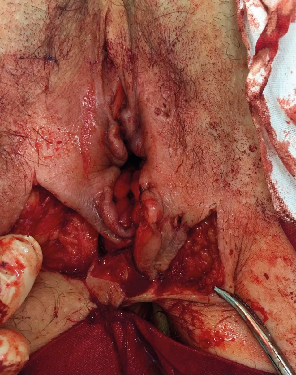 Произведено иссечение предполагаемого входа во влагалище. С техническими трудностями (ввиду рубцовых изменений тканей) остатки неизмененной слизистой влагалища в области предполагаемого входа отсепарованы тупым путем с формированием туннеля неовлагалища. Сформирован купол неовлагалища из брюшины с последующим наложением отдельных швов. Произведен линейный разрез правой большой половой губы. Выкроен, отсепарован лоскут Martius-Symmonds на сосудистой ножке (рис. 2). Диссекция кожно-мышечно-жирового лоскута проводилась с учетом оценки плотности нервов и сосудов [11]. Сформирован тоннель между большой половой губой и правой стенкой сформированного неовлагалища, данный лоскут проведен через тоннель и погружен в среднюю и нижнюю треть боковой стенки неовлагалища в виде «заплатки». Дистальный конец жирового лоскута фиксирован. Из слизистой правой малой половой губы выкроен и отсепарован лоскут вытянутой прямоугольной формы. Данный лоскут уложен поверх жирового лоскута с последующей фиксацией. Аналогичный ход оперативного восстановления влагалища проведен с контралатеральной стороны. Кожа больших половых губ восстановлена интракутанным швом (рис. 3).