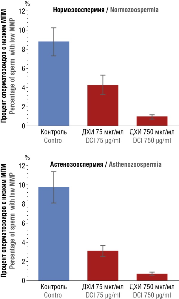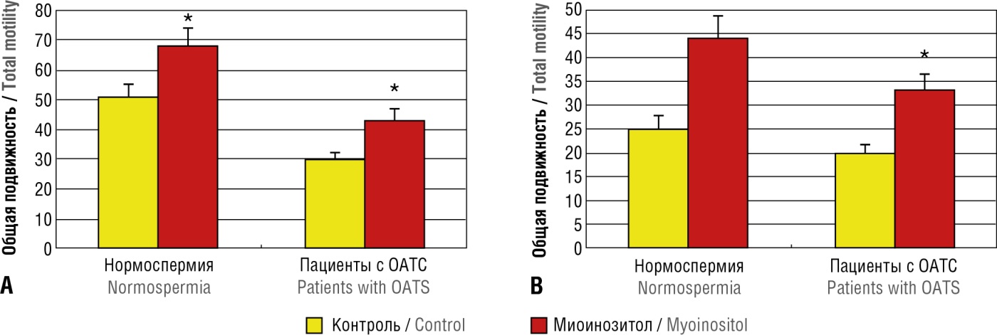 Обеспеченность МИ/ДХИ важна для вызревания, движения сперматозоидов по маточным трубам и для процесса оплодотворения. МИ/ДХИ оказывают воздействие на созревание и функционирование сперматозоидов, регулируя осмолярность и объем семенной плазмы, экспрессию белков, необходимых для эмбриогенетического развития, и подвижность сперматозоидов [14]. Достаточные концентрации МИ/ДХИ в питательной среде культуры клеток значительно увеличивают процент подвижных сперматозоидов как у здоровых мужчин, так и у пациентов с олигоастенотератозооспермией. Улучшение подвижности в последней группе было связано, в частности, со значительным увеличением доли сперматозоидов с высоким мембранным потенциалом митохондрий [15].