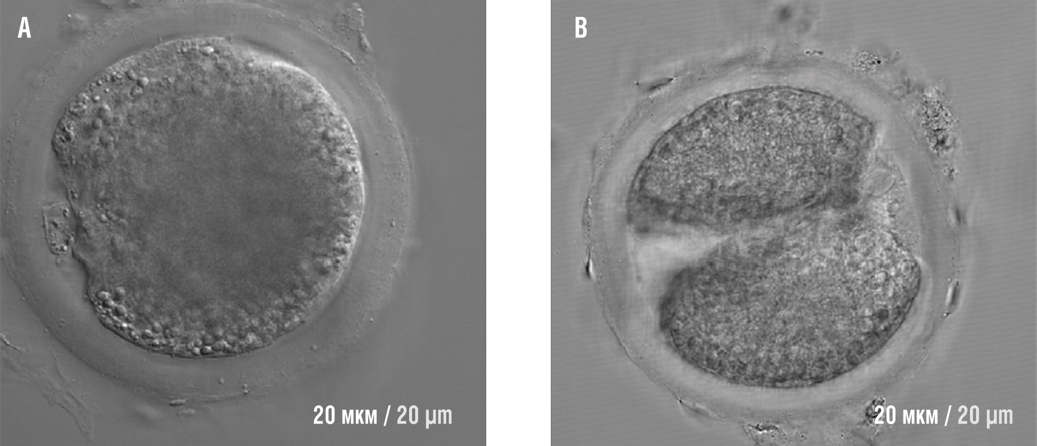 Note: A – phospholipase PIPLC treatment leads to loss of oocyte fertilization (fertility – 0 %); B – no PIPLC treatment, fertilized oocytes after the first division (fertility – 62 % of oocytes were fertilized); scale bar – 20 microns.