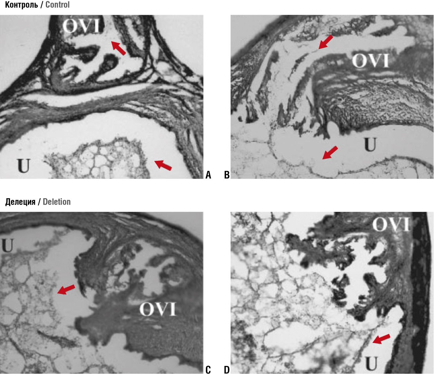 Примечание: PGAP1 – пост-GPI соединяющий белок-1; А и В – норма; С и D – делеция гена. Стрелки обозначают сперматозоиды; при делеции гена не отмечено попадания сперматозоидов в маточные трубы.