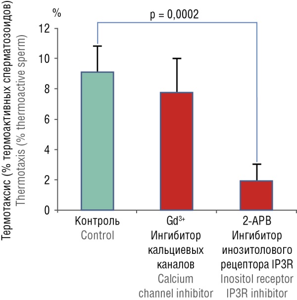 Таким образом, активация миоинозитол-зависимых рецепторов (IP3R) стимулирует секрецию кальция из внутриклеточных компартментов в цитоплазму [17], обеспечивая термотаксис сперматозоидов. Сперматозоиды предварительно инкубировали в течение 20 минут с 2-APB (0,3 ммоль/л) – ингибитором IP3R или с Gd³⁺ (40 мкмоль/л) – ингибитором кальциевых каналов.