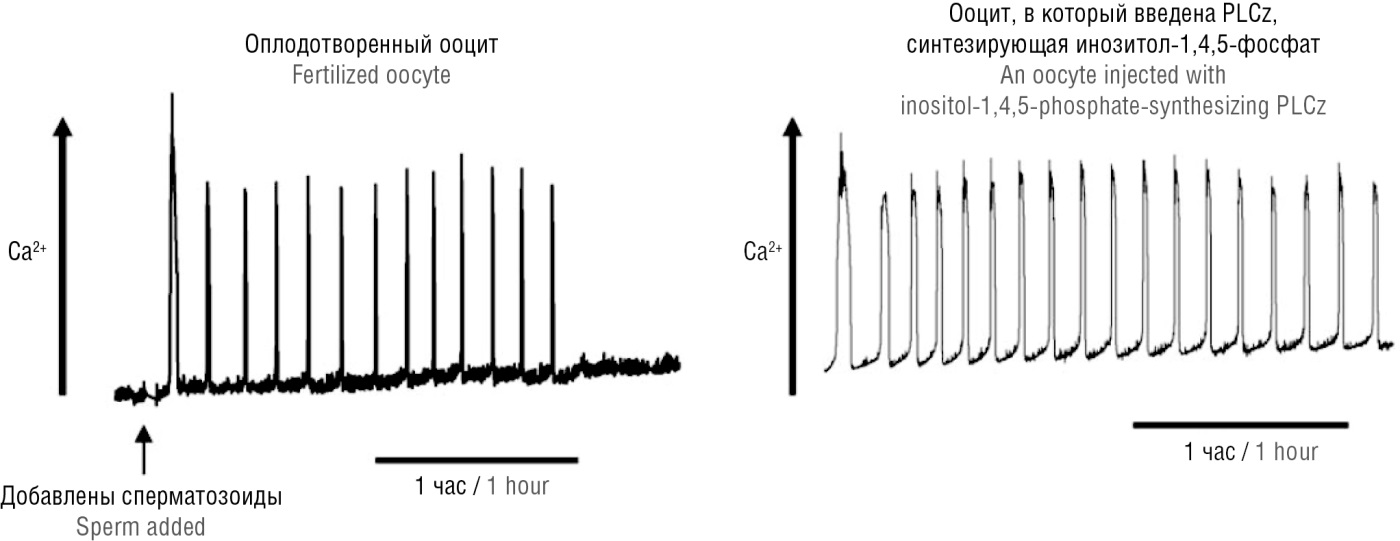 Фермент PLCz активирует синтез IP3, который стимулирует высвобождение кальция из внутриклеточных компартментов ооцита. Фермент PLCz наиболее активен в начале капацитации, в результате чего происходит временная инактивация PI3K. Одновременно IP3 взаимодействует с IP3-рецепторами (IP3R) 1-го и 3-го типов [20], которые и стимулирует секрецию Ca²⁺, ведущую к активации ооцита [21]. В процессе капацитации PLCz постепенно инактивируется протеинкиназой А, что снова активирует PI3K [22], что и приводит к возникновению колебаний уровня кальция (рис. 6).