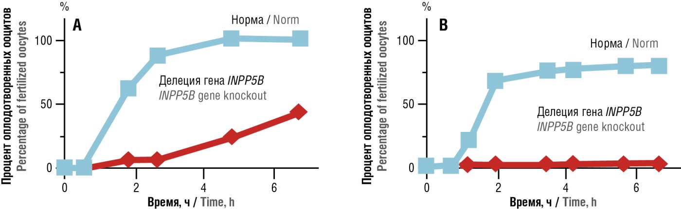 Делеция МИ/ДХИ-зависимого гена инозитол-полифосфат-5-фосфатазы (англ. inositol polyphosphate 5-phosphatase, INPP5B) является одной из известных экспериментальных моделей глубокого дефицита МИ/ДХИ. Сперматозоиды с делецией INPP5B-/- характеризуются значительным снижением оплодотворения ооцитов даже с удаленной zona pellucida [32]. Делеция INPP5B-/- приводит к снижению параметров подвижности (табл. 1) и фертильности сперматозоидов (рис. 12), несмотря на то что капацитация и акросомная реакция происходят.
