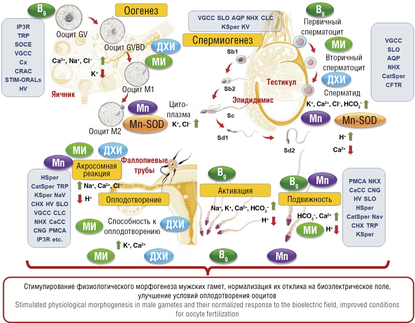 Таким образом, МИ, ДХИ, фолаты и ионы марганца принимают важное участие в сперматогенезе и в оплодотворении (рис. 17). В начале сперматогенеза пул стволовых клеток и его микроокружение поддерживается и регулируется посредством межклеточных взаимодействий, pH, концентрациями ионов электролитов. Клетки Сертоли в эпителии семенных канальцев играют важную роль в развитии гаметоцитов, обеспечивая структурную и питательную поддержку. Электролит-ионы Na⁺, Cl⁻, HCO3⁻, K⁺, Ca²⁺, Mg²⁺ переносятся через различные мембранные насосы, ионные каналы и аквапорины, обеспечивая надлежащий ионный состав, осмолярность и pH жидкости во время сперматогенеза и оплодотворения. Концентрации этих ионов и соответствующие показатели электрического поля изменяются по ходу морфологического развития гаметоцитов [57].