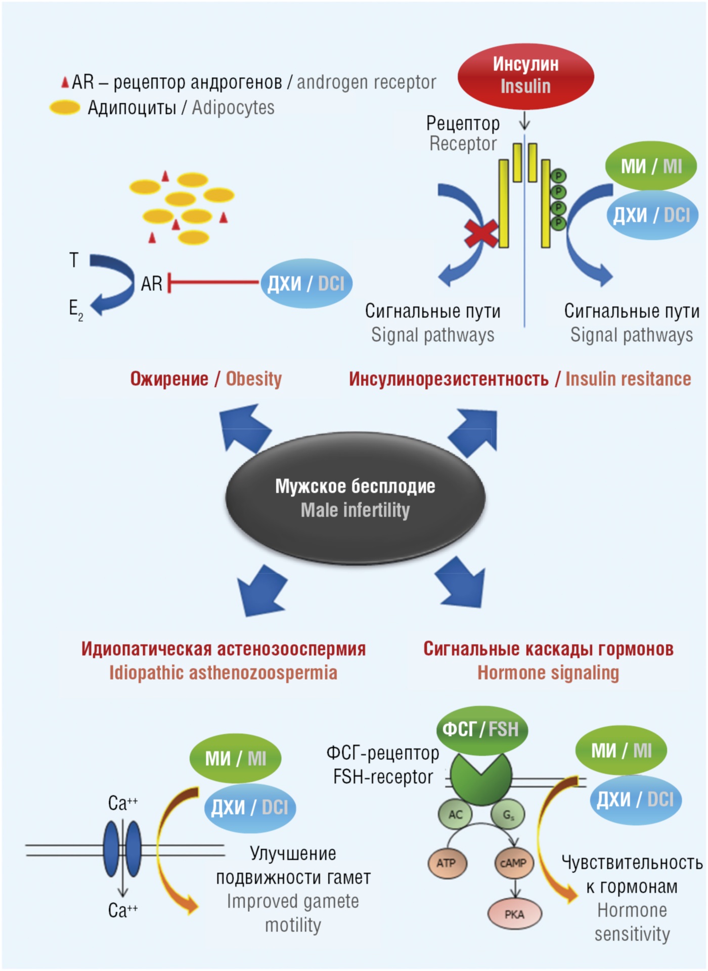 МИ и ДХИ улучшают подвижность сперматозоидов и могут быть назначены пациентам с идиопатической патоспермией. На метаболическое бесплодие, вызванное ожирением, нарушением соотношения эстрогенов и андрогенов и инсулинорезистентностью, можно воздействовать как МИ, так и ДХИ, благодаря их инсулиносенсибилизирующему действию. Наконец, МИ может повышать чувствительность к эффектам эндогенного фолликулостимулирующего гормона (ФСГ) (рис. 1).