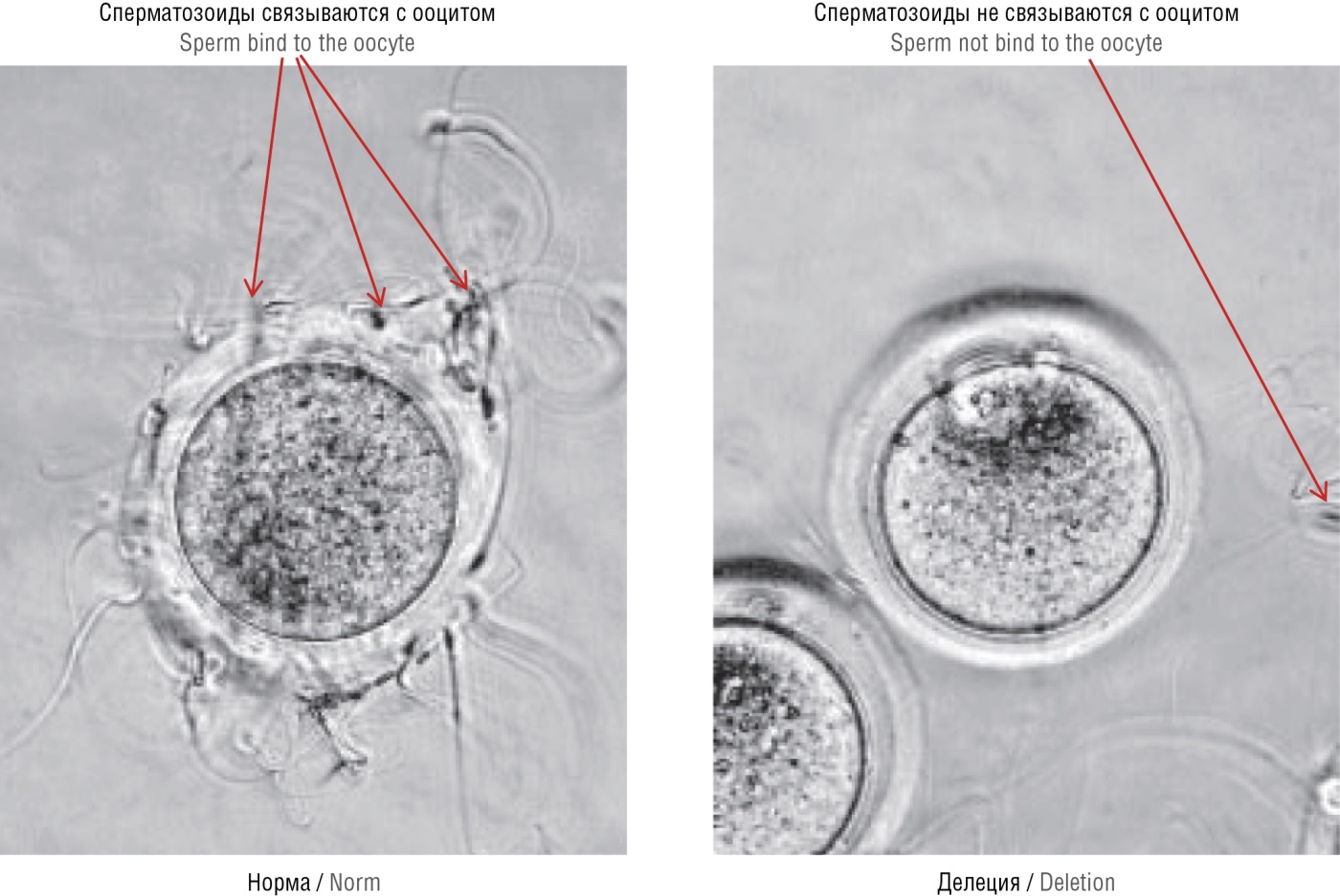 Кроме того, при делеции гена PGAP1 сперматозоиды характеризуются слабым связыванием с zona pellucida. Так, мутантная форма спермы показала связывание 2,9 сперматозоидов на яйцо, в норме – 11,9 (р = 0,0001). Фертильность мутантной формы составила 2,7 % по сравнению с 51,0 % для нормальных сперматозоидов (рис. 10) [28].
