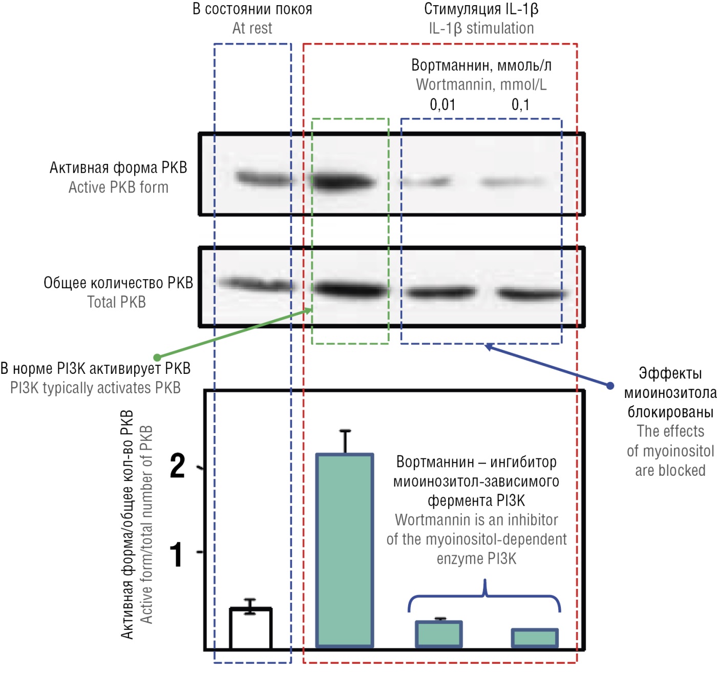 Сигнальный миоинозитол-зависимый белок фосфатидилинозитол-3-киназа (англ. phosphatidylinositol- 3-kinase, PI3K) участвует в передаче сигнала от рецепторов различных гормонов, ростовых факторов и цитокинов, активность которых важна для вызревания сперматозоидов. В частности, фермент PI3K необходим для передачи внутриклеточного сигнала от рецептора интерлейкина-1β (англ. interleukin, IL-1β) в клетках Сертоли (рис. 2). IL-1β обеспечивает тонкую настройку клеточных процессов, вовлеченных в поддержание сперматогенеза. Ингибитор PI3K вортманнин уменьшает стимулируемый IL-1β транспорт глюкозы и синтез молочной кислоты, необходимых для нормального развития сперматозоидов [16]. Клетки предварительно инкубировали в течение 15 минут с вортманнином (0,01 и 0,1 ммоль/л) и затем стимулировали в течение 15 минут 50 нг/мл IL-1β. В норме активация миоинозитол-зависимой PI3K при связывании IL-1β одноименным рецептором приводит к увеличению фосфорилированной формы важнейшего сигнального белка – протеинкиназы В (англ. phosphorylated protein kinase B, P-РКВ) без изменения общего уровня протеинкиназы В (англ. total PKB, T-РКВ). Очевидно, что применение ингибитора PI3K привело к значительному снижению фосфорилированной формы (P-РКВ).