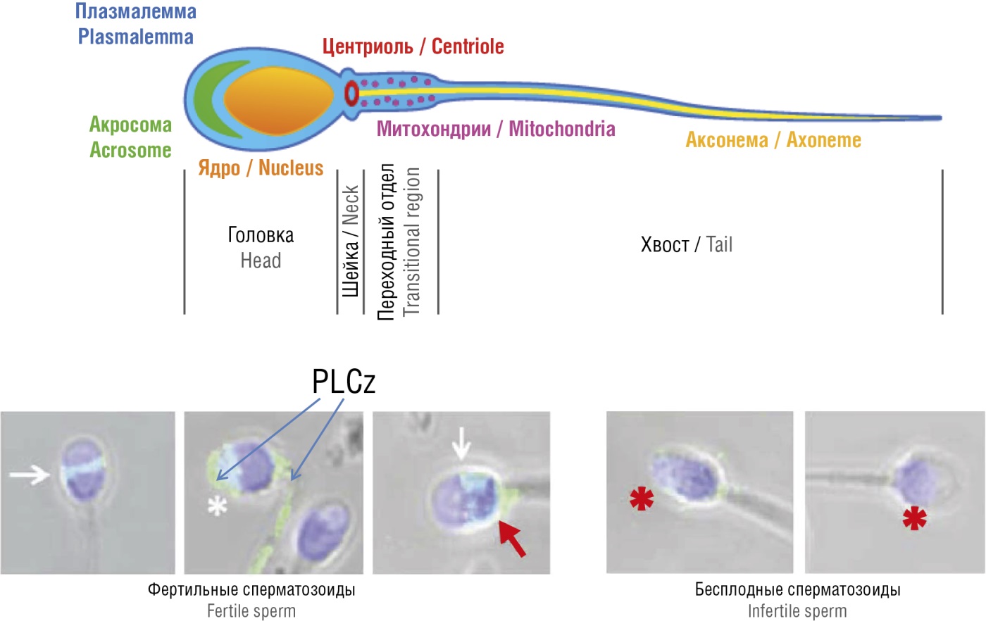 В норме внутриклеточная локализация PLCz наблюдается в области акросомы, экваториальном сегменте и в постакросомной области, а при нарушениях фертильности отмечается резкое снижение уровня PLCz наряду с абнормальной локализацией фермента в головке сперматозоида (рис. 4) [19].