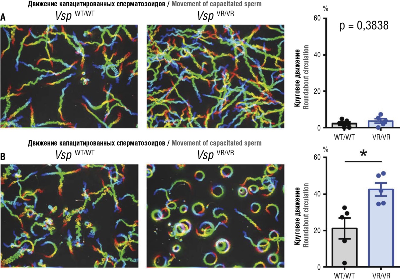 Примечание: VSP – потенциал-чувствительная фосфатаза; делеция гена соответствует глубокому дефициту МИ/ДХИ. Слева: траектории сперматозоидов, выделенных у интактных и VspVR/VR мышей. Сперматозоиды инкубировали в питательной среде 10 минут (А) и 2 часа (В). Справа: статистический анализ был проведен для процента клеток, демонстрирующих круговое движение, с использованием непарного двустороннего t-критерия (*p < 0,05). Данные представлены как среднее значение ± стандартная ошибка.