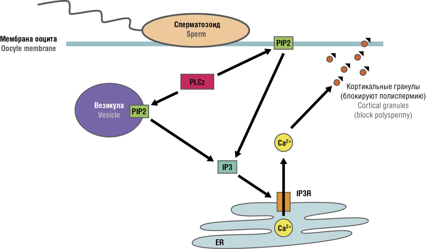 Примечание: PIP2 – фосфатидилинозитол 4,5-бисфосфат; IP3R – инозитол-1,4,5-трифосфат рецептор; по слиянии мембран сперматозоида и ооцита PLCz диффундирует из головки сперматозоида в яйцеклетку. PLCz осуществляет высвобождение активной формы миоинозитола (IP3) из фосфолипидов мембраны, секрецию Са²⁺ из эндоплазматической сети (ER) с последующим экзоцитозом корковых гранул и делением оплодотворенного ооцита.