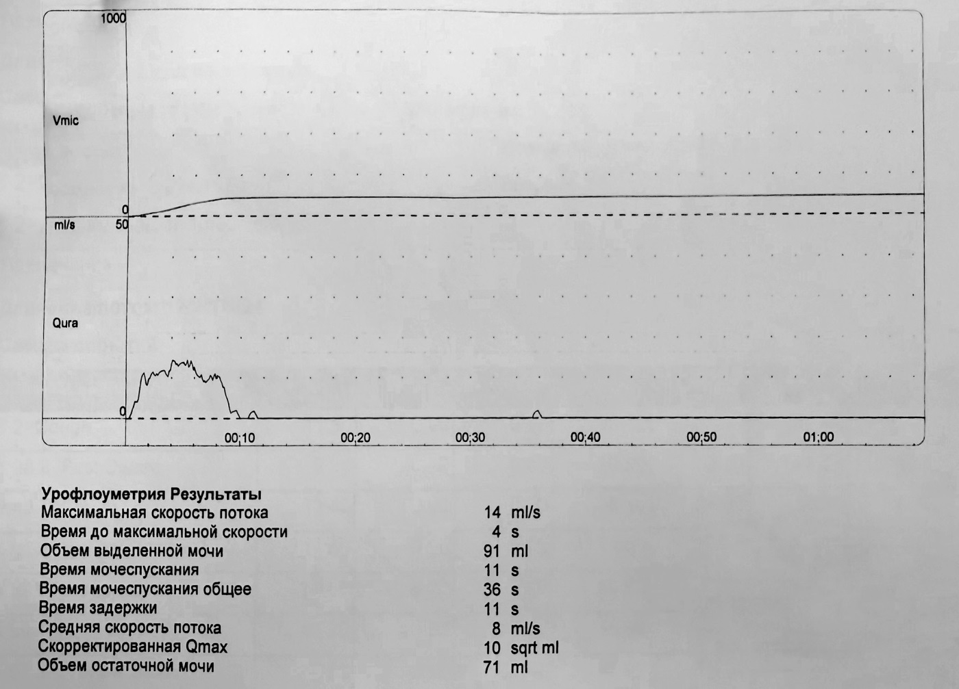 Рисунок 1. Пациентка Б., 54 года. Урофлоуметрия: кривая потока, объем остаточной мочи – 71 мл.