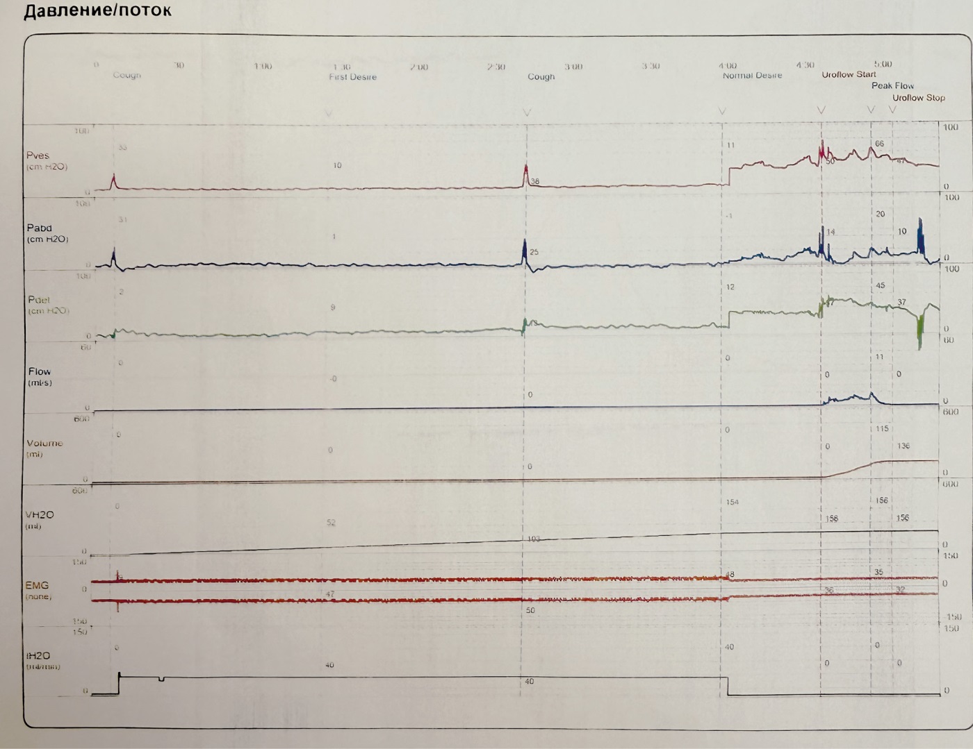 Рисунок 2. Пациентка Б., 54 года. Кривая давления/потока во время комбинированного уродинамического исследования.